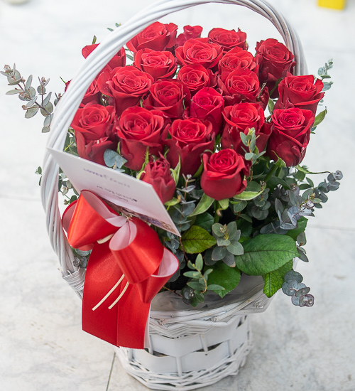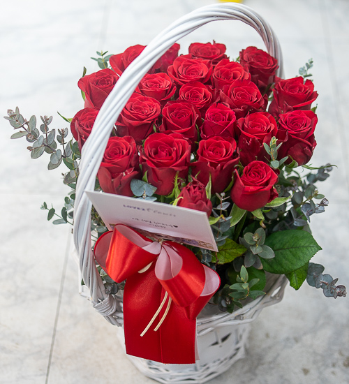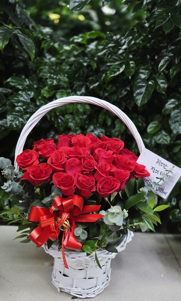 정열적이면서 낭만적인 느낌을 싱싱한 고급 빨강장미를 사용해 연출해보았습니다.오늘의 주인공이신 그분에게 정열과 낭만을 전해보세요. 네프로네프스,편백등 녹색의 소재를 사용하여 빨강장미를 더욱 강조하였습니다.
