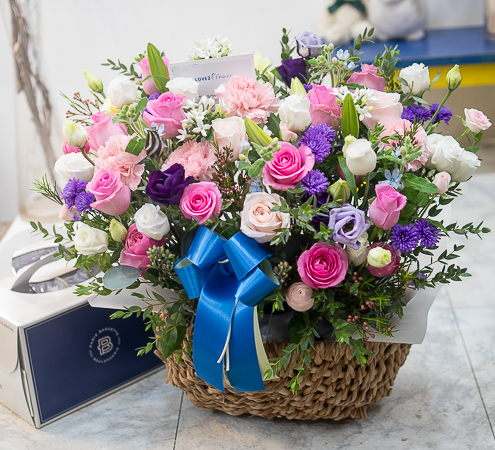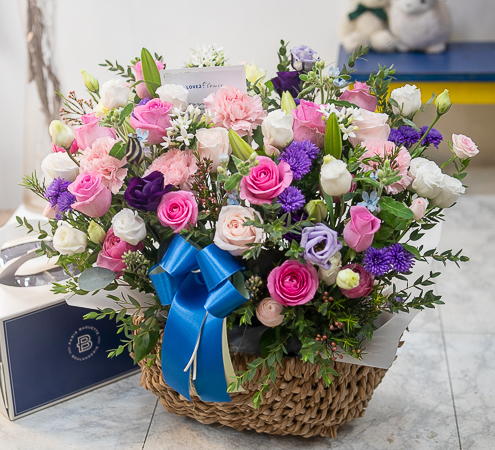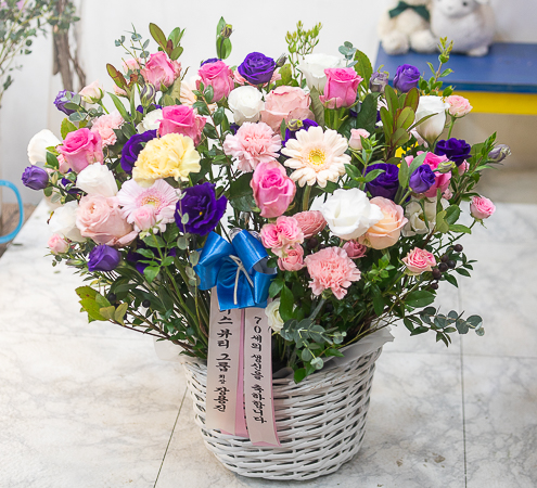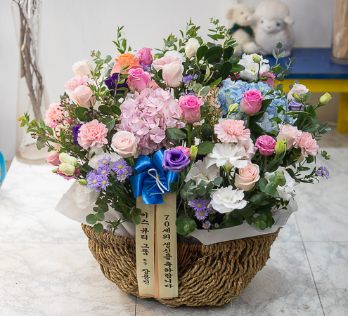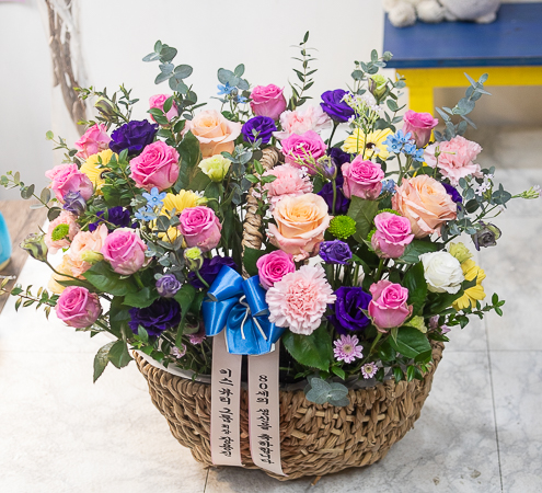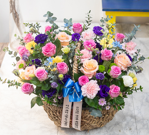 보라와 핑크색이 어우러지 시원한 분위기를 연출한 꽃바구니로 생일,기념일,축하용으로 보내시는분의 품위를 같이 전해보세요.
