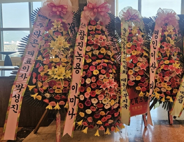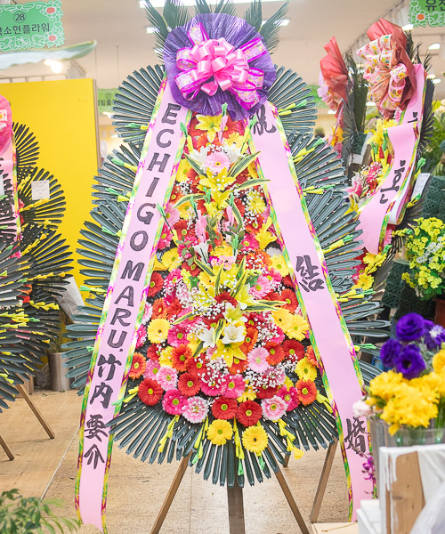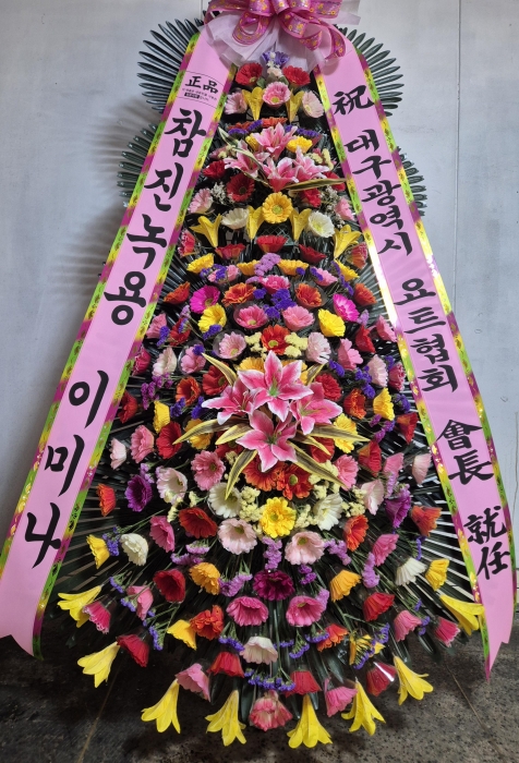 개업,결혼,칠순,전시회,연주회,기념회,발표회등 많은사람이 모이는 장소에서 큰리본과 함께 보내시는분의 정성과 품위를 느끼게 될겁니다.높이가 2m20cm이상으로 축하화환중 제일키가 큼니다.