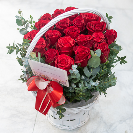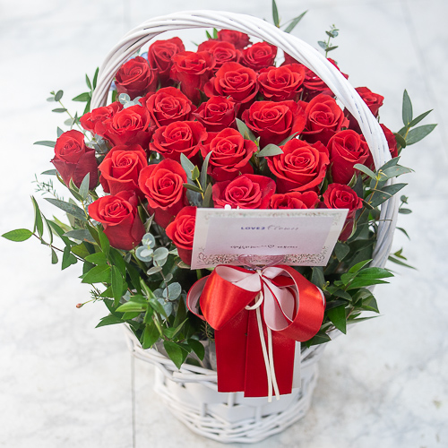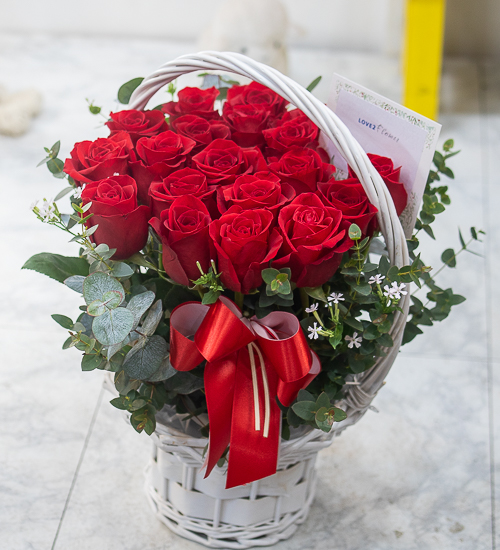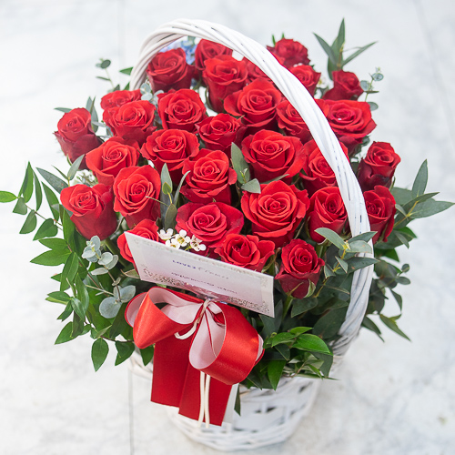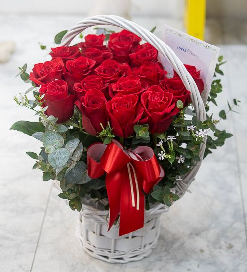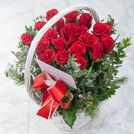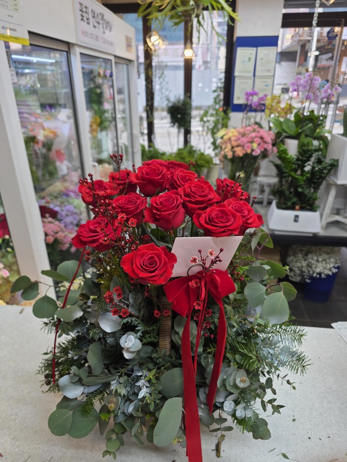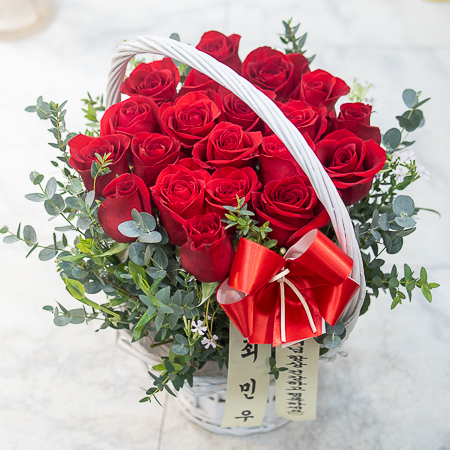 정열적이면서 낭만적인 느낌을 싱싱한 고급 빨강장미를 사용해 연출해보았습니다.오늘의 주인공이신 그분에게 정열과 낭만을 전해보세요. 네프로네프스,편백등 녹색의 소재를 사용하여 빨강장미를 더욱 강조하였습니다.